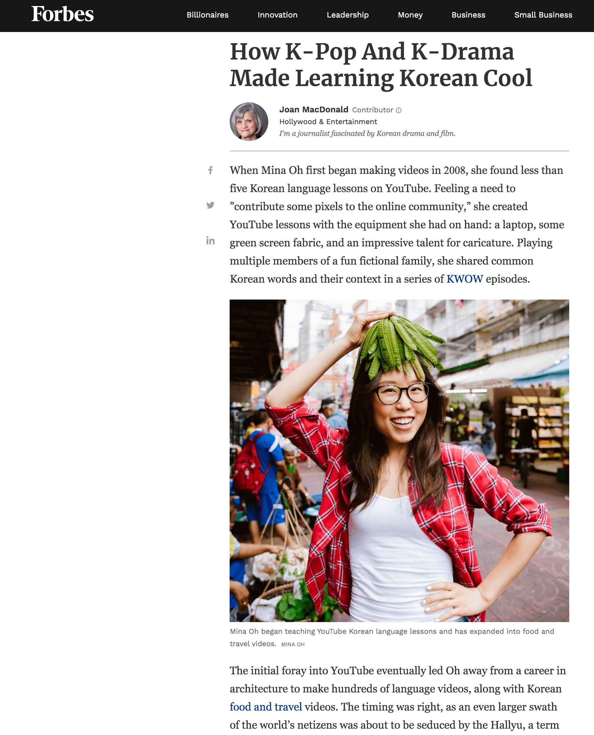 Featured on Forbes article about K-Pop, K-Drama and Korean Language.